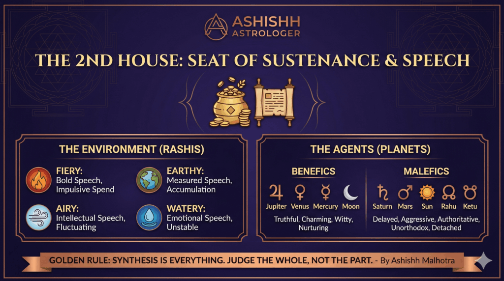 The 2nd House is the Dhana Bhava (wealth), yes, but fundamentally it represents sustenance. It is everything that keeps the body and soul together right after birth. It is your food, your immediate family (Kutumba), your primary education, and crucially, your speech (Vani).