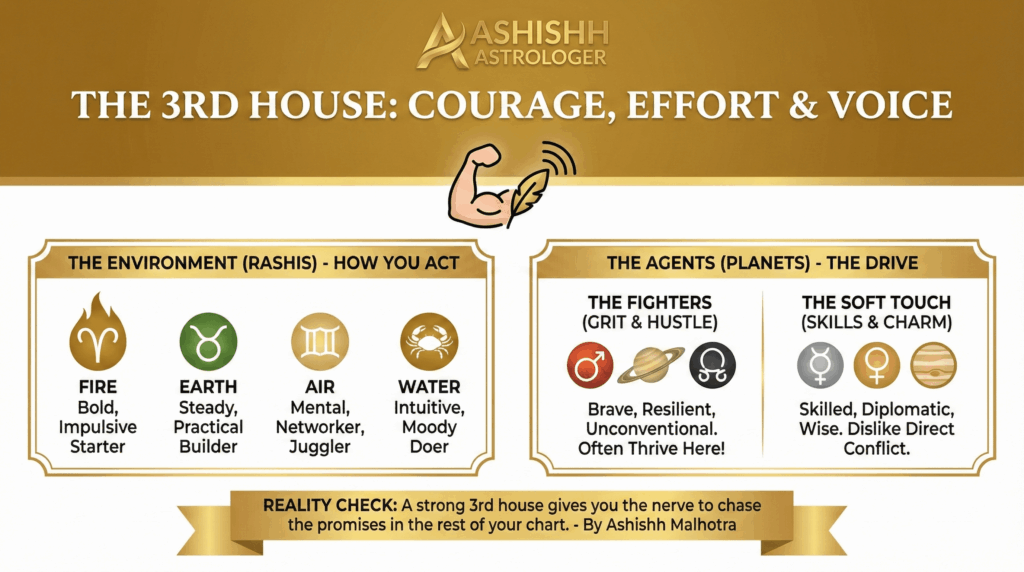 This is where the 3rd house gets interesting. Unlike many other houses, malefic (harsh) planets often do very well here. Why? Because life requires grit, and malefics provide the fuel to fight battles.